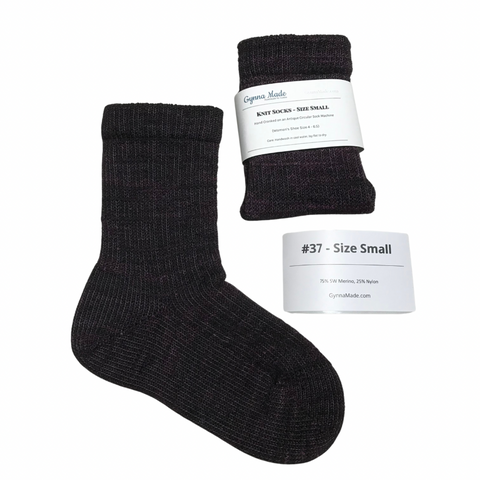 Each pair of socks is hand cranked on an antique circular sock machine (CSM), hand finished with a Kitchener knitting stitch which results in a seamless toe, and prewashed to set the size.