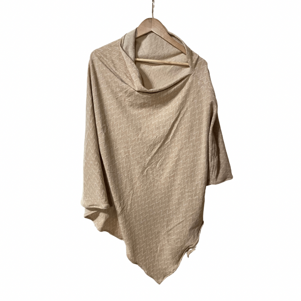 The poncho is perfect for layering over our Scoop Neck Tshirt! Made with Electra a medium weight jacquard knit fabric, this poncho will add personality to your wardrobe!